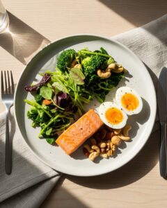 Privilégiez une alimentation équilibrée, riche en fibres, légumes verts et oméga-3 (oléagineux, poissons gras).